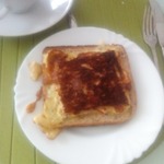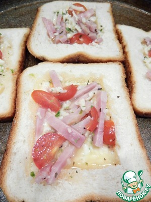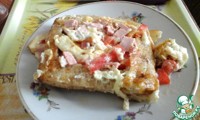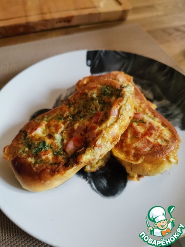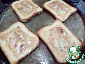 Выкладываем ломтики (без серединки) на сковородку и вливаем в серединку нашу яично-ветчинно-сырно -помидорную смесь.