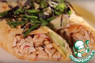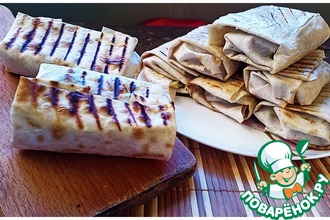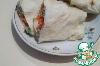 Смешать сметану и майонез, смазать лист лаваша, потом смазать кетчупом. Нарезать овощи, салат помыть и промокнуть салфеткой, уложить вдоль короткого края, добавить куриное филе, натертый сыр. Завернуть в плотный рулет, обжарить на сковороде-гриль по 2 минуты с каждой стороны. Приятного аппетита)