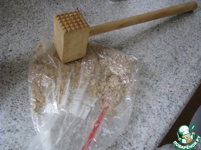 Пока наша овсянка набухает, измельчаем наши грецкие орехи (не в труху). Кладем их в плотный полиэтиленовый мешок, и стучим по ним скалкой или как у меня молоточком для мяса.