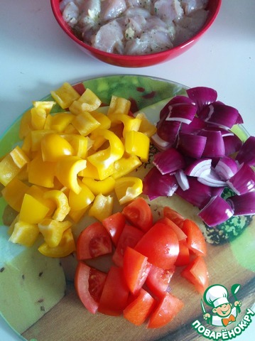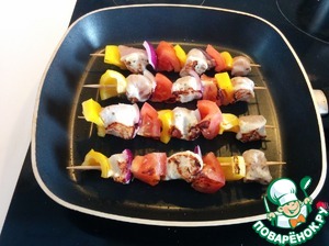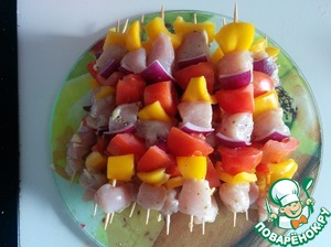 Достаем мясо из маринада и нанизывем на деревянные шпажки попеременно с овощами (предварительно замачиваем шампуры на 20 минут в воде, чтобы они не горели). Солим, перчим по вкусу.