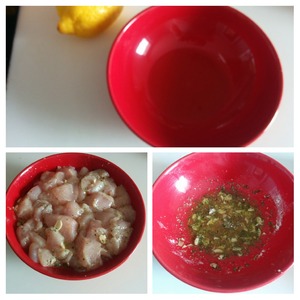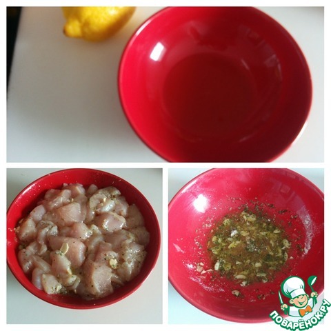 В миске смешиваем куриные кубики с 2 столовыми ложками оливкового масла, чесноком, орегано, солью и черным перцем. Маринуем 30 минут.