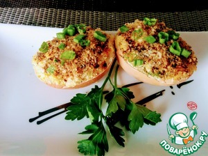 Фаршируем получившейся массой скорлупу и посыпаем сухарями. Топим оставшееся масло, яичные половинки выкладываем сухарями на сковороду. Накрываем крышкой и держим на среднем огне в течение нескольких минут.