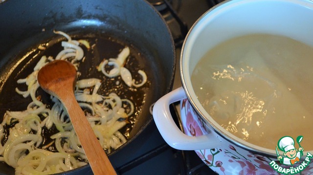 Лук почистить и нарезать полукольцами. -