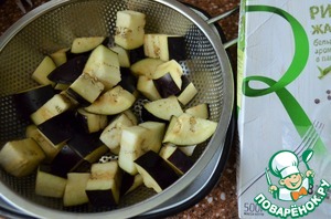Пока закипает вода для варки риса, вымыть и нарезать кубиками баклажан.