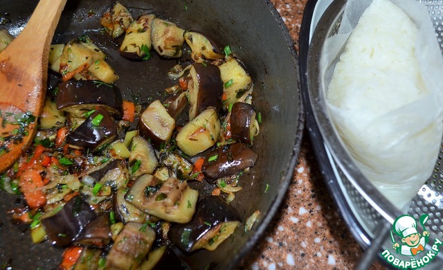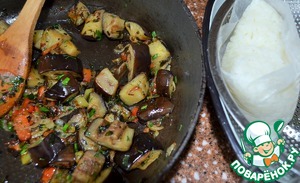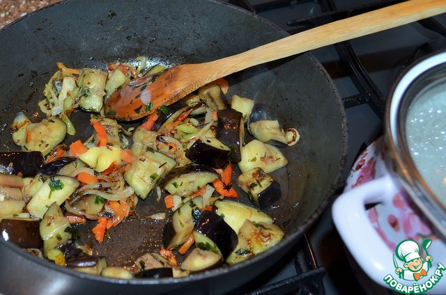 Добавить к луку перец, баклажан.