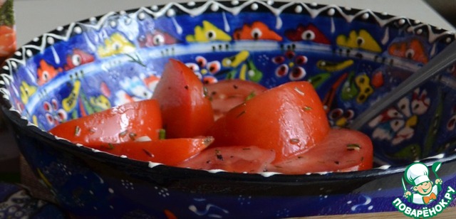 В это время можно вымыть и нарезать помидор, посолить и заправить его маслом и зеленью. Салат готов.