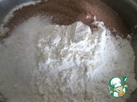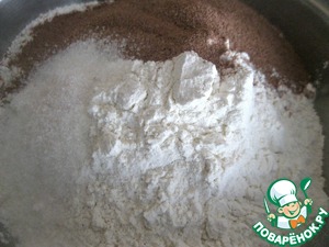 Смешать муку, сахар, соль и какао. |