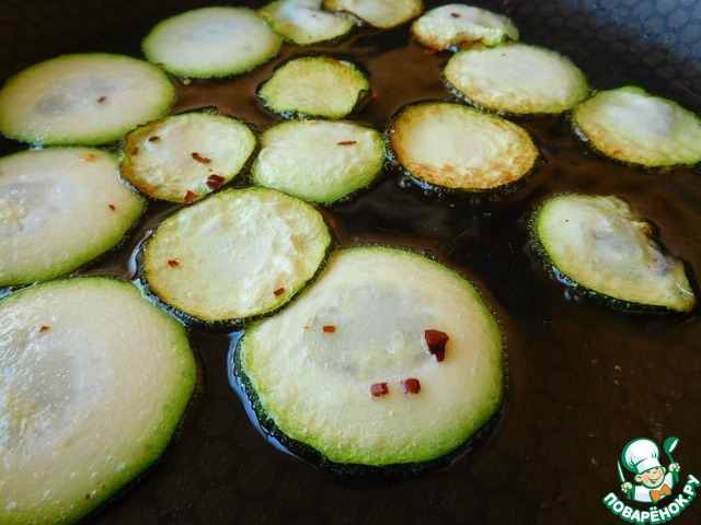 Цуккини нарезаем тоненькими кружочками и обжариваем на среднем огне с одной стороны.