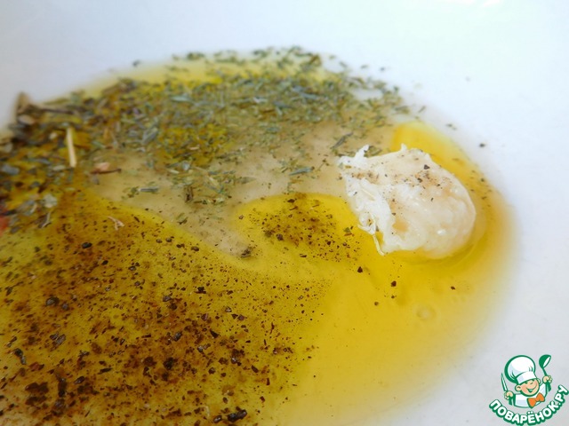 Смешиваем оливковое масло, лимонный сок, мед (если густой, то после массу нужно слегка прогреть, чтобы мед растворился) и травы.