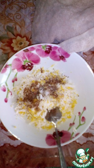 Подготовить фарш: натереть на терке сырки и сваренное в крутую яйцо, смешать добавить сливочного масла (я вместо сливочного масла добавила 1ч. л. сливок) и растереть все в однородную массу. По рецепту нужно еще посолить я не стала этого делать так как сырки и так соленые этого хватает для начинки, еще немного при перчила.