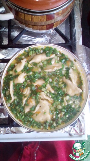 Когда картофель сварится, положить в бульон зажарку, специи, рубленую зелень. Довести до кипения и опустить приготовленные "ушки". Подождать когда всплывут "ушки", варить еще 10 минут.
