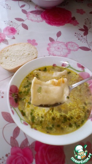 На квадратики теста выложить по чайной ложке фарша и защепить, как вареники. С фотографии четко видно, что с геометрией и лепкой вареников я не очень дружу. Для себя решила, в следующий раз делать квадратики 2х2см., так в супе будет выглядеть красивей.