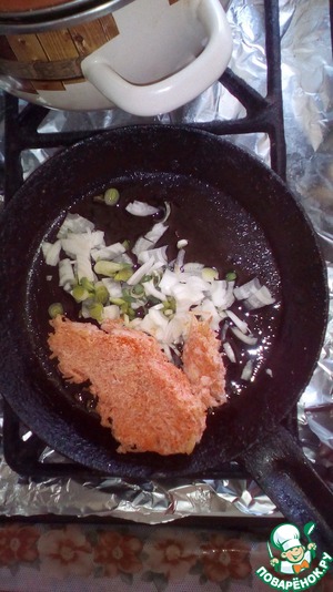 Измельчить лук и морковь обжарить на растительном масле. У меня морковь мороженая вместо окорочка, в зажарку, я добавила 1 ст. л. утиного жира.