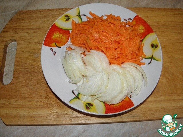 Лук нарезать полукольцами, морковь брусочками (лучше на корейской терке)