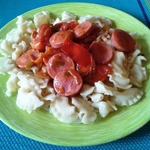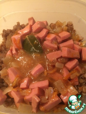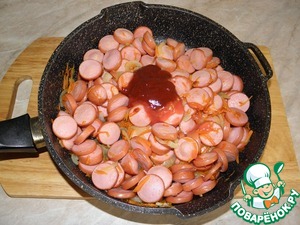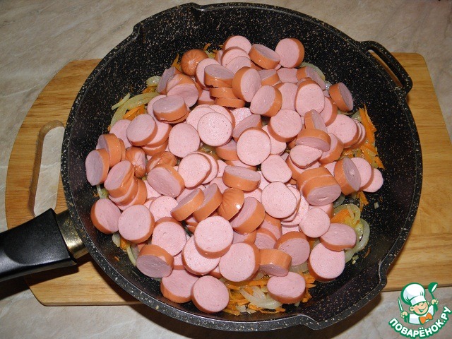 Сосиски (или сардельки) нарезать кружочками, выложить к луку с морковью