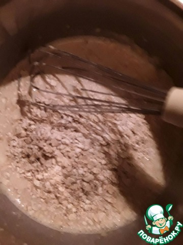 Добавляем с получившейся смеси овсяные хлопья и снова хорошо перемешиваем.