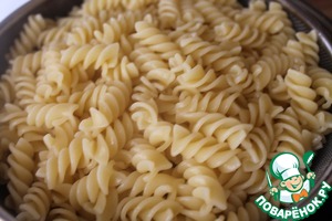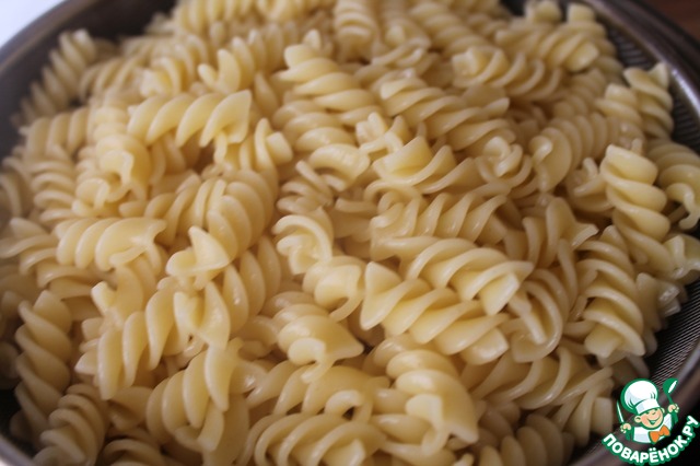 Пасту отварим в кипящей подсоленной воде, откинем на сито. |
