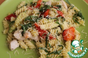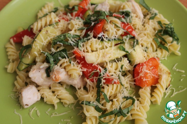 Описание: Яркие, красивые фузилли! Сочетание курицы и овощей аль денте дополняют зеленый базилик и фенхель. Очень важно не пренебрегать этим травами - именно они придают пасте необычный вкус свежести. Приготовьте ее, Вам непременно понравится!