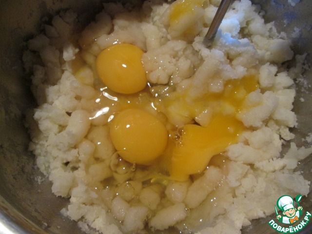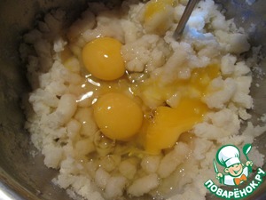 • Для теста горячий отваренный картофель растолките в пюре, добавьте соль, яйца, перемешайте.