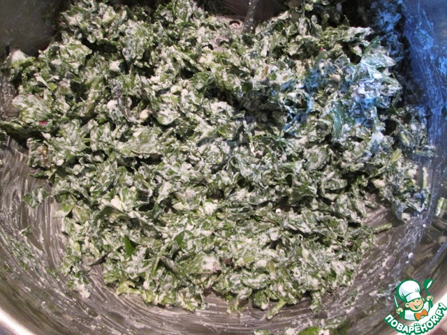 • Для начинки можно использовать как щавель, так и смесь щавеля и шпината в любой пропорции. Добавление шпината сделает начинку более яркой, т. к. его зелень сохранят цвет при тепловой обработке. У меня был только щавель. Итак, зелень моем, сушим, удаляем грубые стебли и нарезаем короткими широкими ленточками. Растираем творог со щавелем, солим, перчим и добавляем сахар. Сладость регулируйте по своему вкусу, начинка должна быть кисло-сладкая.