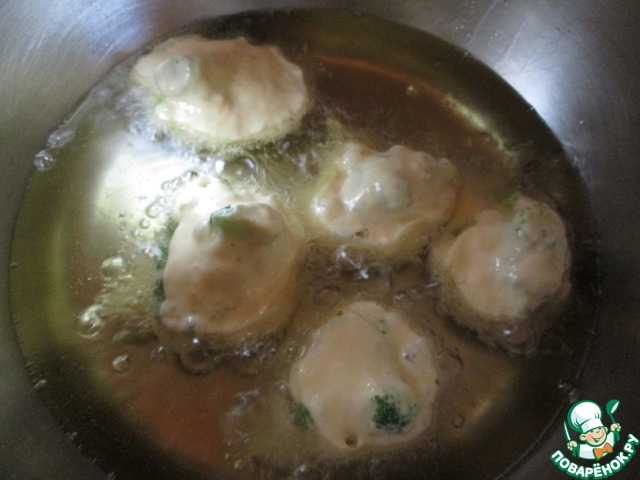 Разогрейте масло для фритюра в сотейнике или глубокой сковороде. Зачерпните ложкой небольшое количество теста вместе с брокколи и опустите во фритюр. Жарьте пончики до появления румяной корочки, выкладывая готовые на бумажные полотенца или в дуршлаг, чтобы стек лишний жир.