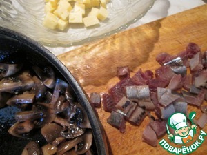 Сельдь нарежьте небольшими кусочками, сыр - кубиками, четвертинкм шампиньонов обжарьте на сливочном масле.
