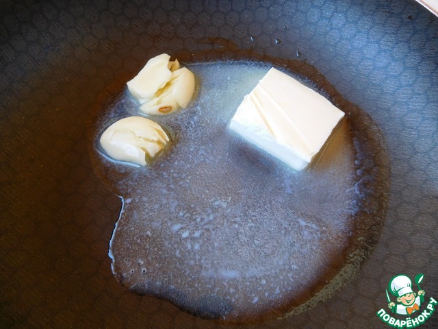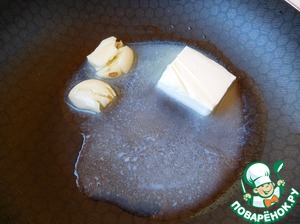 Раздавленные зубчики чеснока обжариваем на сливочном масле на среднем огне минут 5.