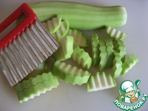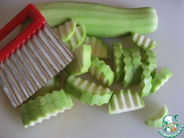 Кабачок помыть, очистить от кожуры, разрезать пополам. Каждую половинку ещё раз нарезать на небольшие полусферы. Я использовала специальный нож для фигурной нарезки овощей.