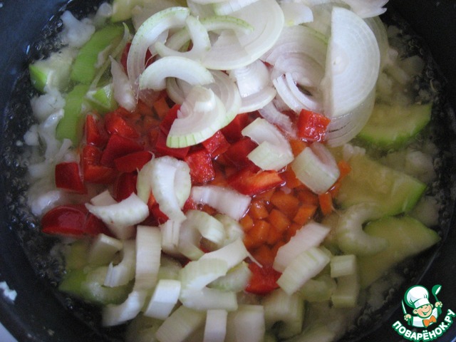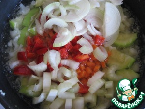 Затем добавить остальные овощи все вместе: морковь, лук, перец болгарский и сельдерей. Перемешать.