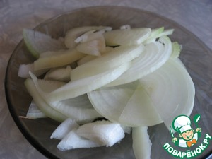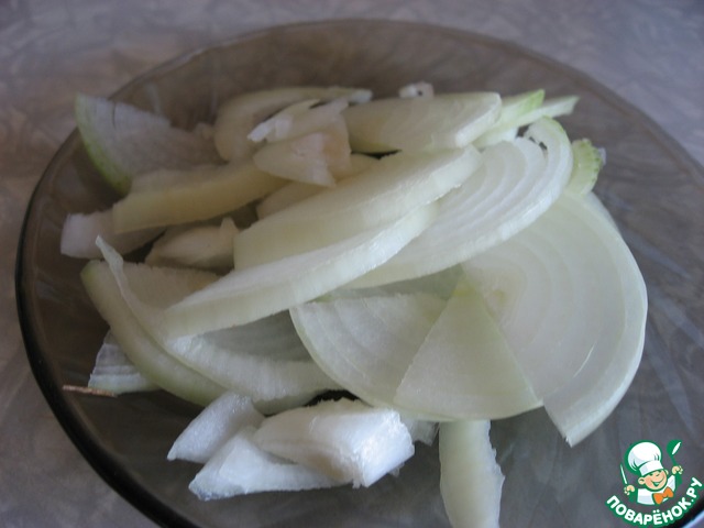 Лук очистить от шелухи, помыть и нарезать полукольцами.