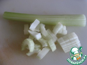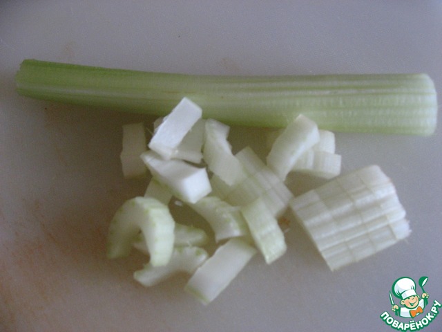 Сельдерей помыть, очистить от прожилок, нарезать тонкими полукольцами