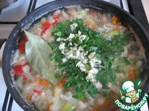 Затем добавить зелень, лавровый лист, чеснок и соль по вкусу.
