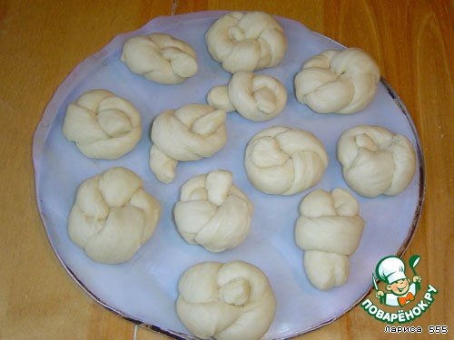 Готовое тесто разделать на булочки. Противень смазать маслом. Я делаю жгутики, а из них - булочки.