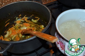 • Обжарить морковь с луком до прозрачности.