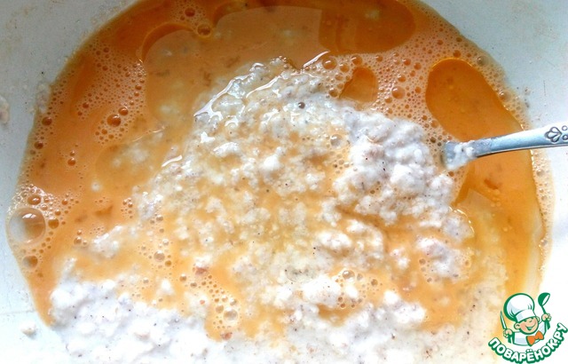После набухания хлопьев и манки добавить сахар, соль, разрыхлитель и корицу. Все перемешать. Масса будет густая. Я оставляю на 5 минут постоять, чтобы сахар растаял. Корицу, если не любите, можно не добавлять, а заменить на ваниль.