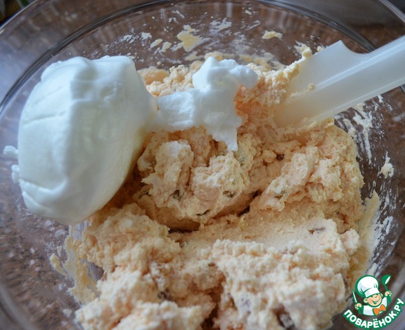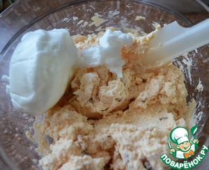 Белки взбить со щепоткой соли до устойчивых пиков и аккуратно, частями вмешать в творожную массу.