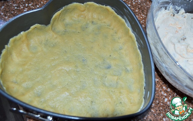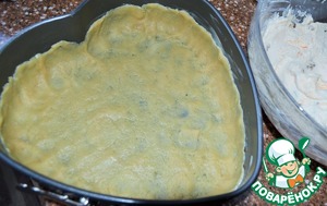 Большую часть теста раскатать и выложить в форму, формуя бортики. -