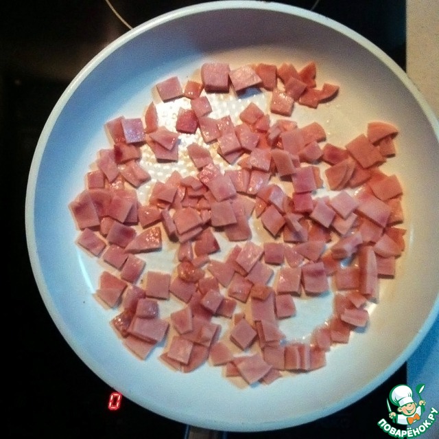 На сковороду налить немного оливкового масла и поставить на небольшой огонь. Ветчину в тонкой нарезке порезать на квадратики примерно 1,5х1,5 см и выложить на сковороду. Поставить греться воду для пасты (не забудьте посолить)).
