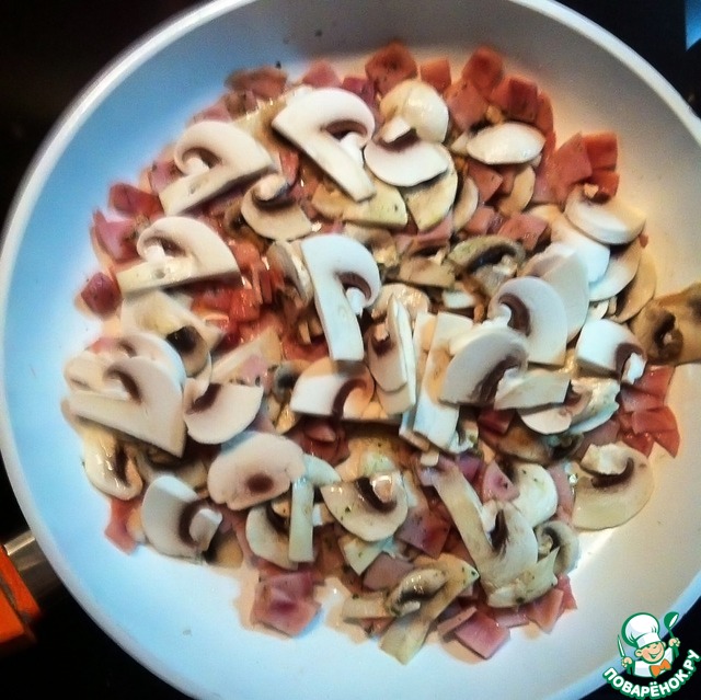 Почистить и тонко нарезать шампиньоны, добавить их к ветчине и увеличить огонь до среднего, периодически помешивая. Добавить чёрный перец, орегано и петрушку.