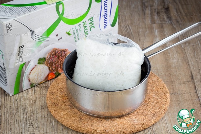 Первым делом необходимо отварить рис. Для этого поставим сотейник на большой огонь, вскипятим воду и опустим в нее пакетик с рисом жасмин ТМ "Мистраль". Посолить по вкусу.