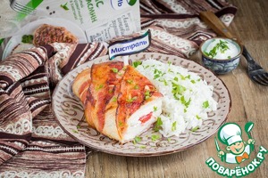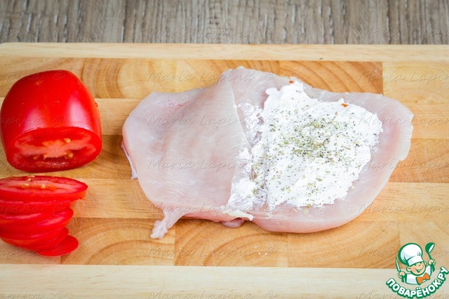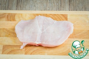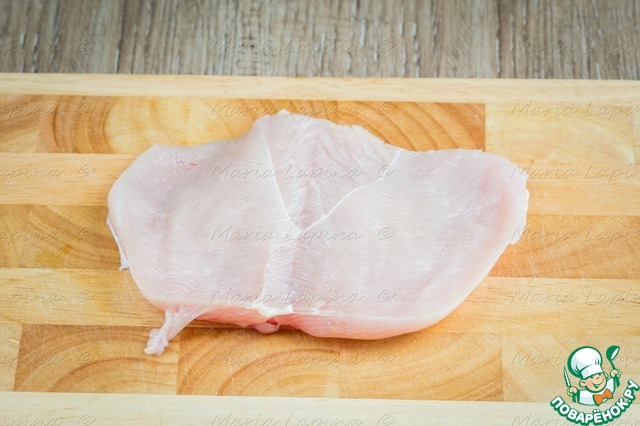 Пока варится рис, приготовим курицу. Куриное филе разрезать вдоль не до конца и открыть как книжку.