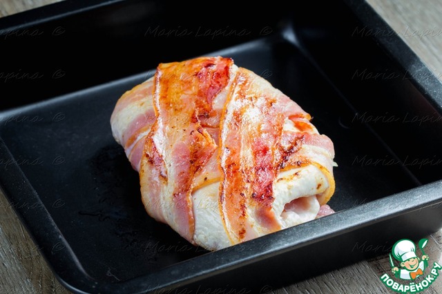 Закрыть филе полосками бекона. Обжарить с двух сторон по 1,5 минуты до румяности. Переложить обжаренное филе в беконе в форму или на противень. Запекать 7-10 минут до готовности при температуре 200С. Проверять готовность, проткнув зубочисткой в самом толстом месте, сок должен быть прозрачным, не розовым.