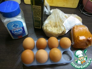 Приготовим основные ингредиенты для блюда. Далее надо отварить 6 яиц в подсоленой воде в течение 15 минут, охладить, очистить от скорлупы.