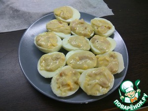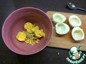 Остывшие очищенные яйца разрезать на половинки и отделить желток.