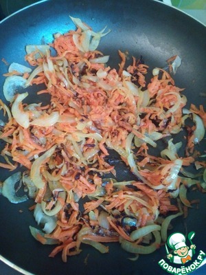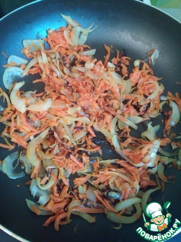 Лук режем, морковку трем на крупной терке и обжариваем в подсолнечном масле