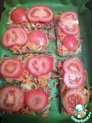 Помидоры режем ломтиками и укладываем на треску следующем слоем.
