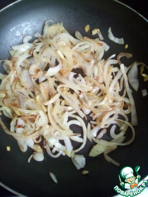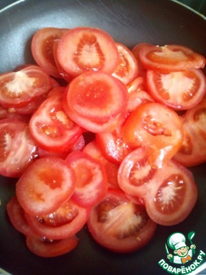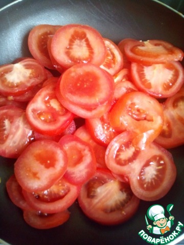 Пока кольцо готовится приготовим соус: помидоры режем кольцами и жарим на сковородке в масле.