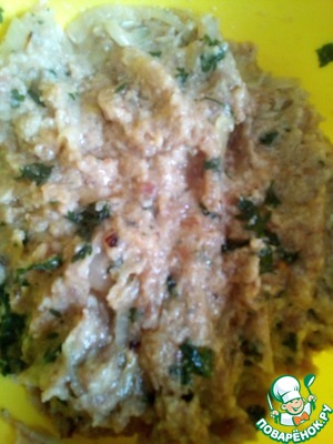 В фарш добавляем яйца, хлеб, лук, зелень, соль, перец и специи по вкусу.