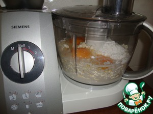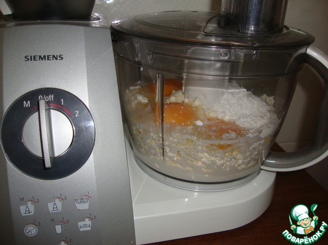 В чашу кух. комбайна положить творог, яйца, сахар, крахмал и сливки.