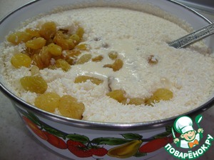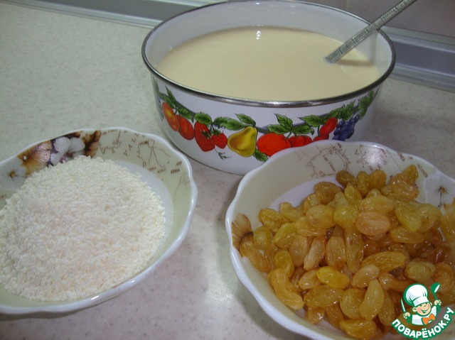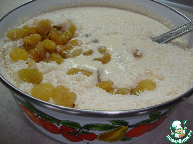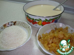 Приготовить для начинки изюм ( промыть и подсушить) и кокосовую стружку.